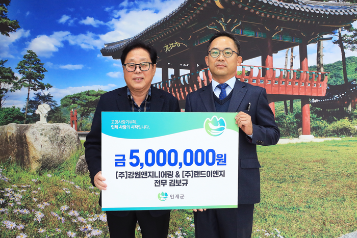 (주)강원엔지니어링 김보규 이사는 11월 25일 인제군청을 방문해 지역발전을 위해 써달라며 고향사랑기부금 5백만 원을 기탁했다.